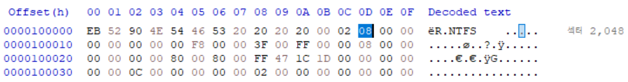 아래를 보면 VBR이 0x00 00 08 00으로 2048번째 섹터에 위치 해 있는 것을 확인 할 수 있다.