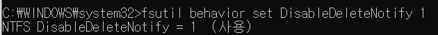 CMD 관리자 권한으로 fsutil behavior set DisableDeleteNotify 1 명령어로 비활성화가 가능하다.