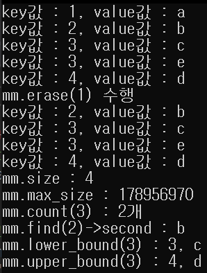 cout << "mm.count(3) : " << mm.count(3) << "개" << endl; //key가 3인 원소 갯수