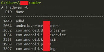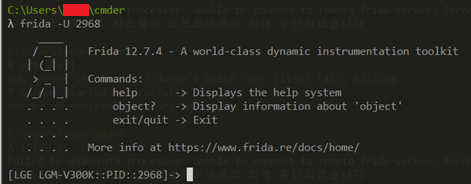 - Ctrl+C 통해 shell 빠져나오고 frida-ps -U