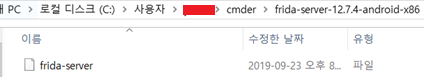 - Cmder에서 adb push [frida-server파일경로]\frida-server /data/local/tmp