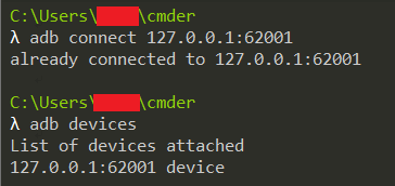 - adb connect 127.0.0.1:62001
