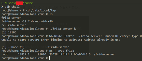 - Cmder에서 adb push [frida-server파일경로]\frida-server /data/local/tmp